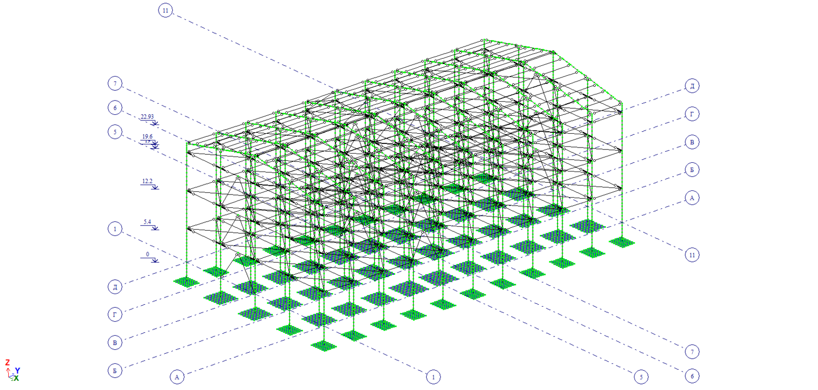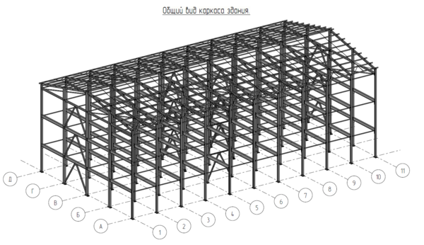 Выполнены все разделы конструктивной части крупного цеха из стальных конструкций (КМ, КЖ, РР). Стадия П+Р.